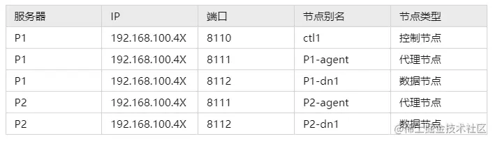 基于两台服务器搭建双副本普通集群,假设两台服务器名称分别为 P1、P2,P1 部署一个控制节点、一个代理节点、一个数据节点,P2部署一个代理节点、一个数据节点,如表所示。
