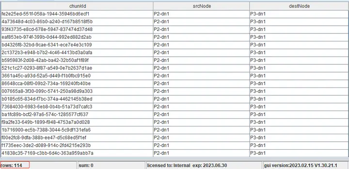 返回预估分区迁移结果,如图所示,预估 P1-dn1、P2-dn1 共有114个分区迁移至 P3-dn1。