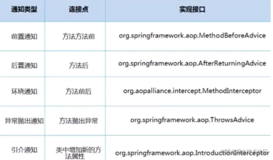 在SpringAOP中,通过Advice定义横切逻辑,Spring中支持5种类型的Advice:具体如下图所示: