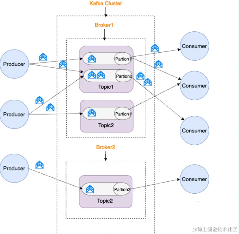 同时,你一定也注意到每个 Broker 中又包含了 Topic 以及 Partion 这两个重要的概念: