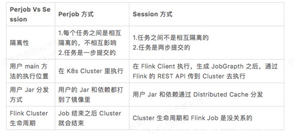 4. 用户的 main 方法是在 Cluster 里运行。在特殊网络环境情况下,main 方法需要在 Cluster 里运行的话,Session 方式是无法做到的,而 Perjob 方式是可以执行的。