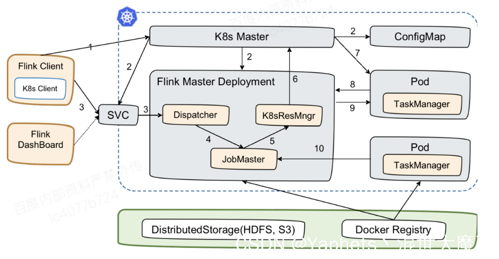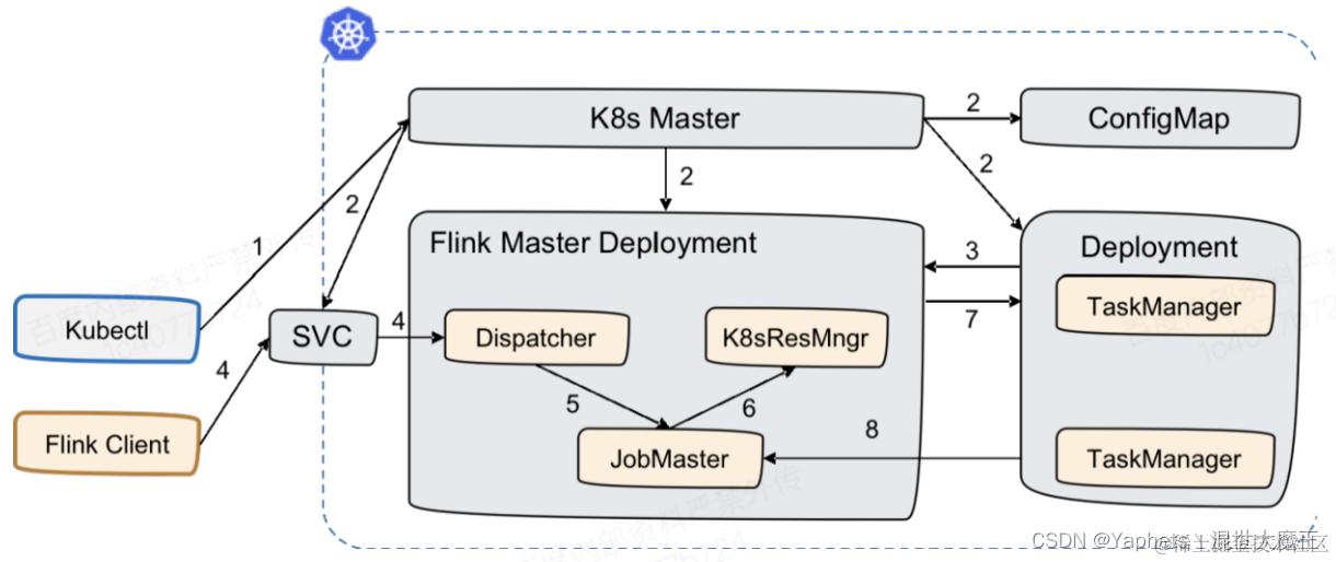 - 步骤2, K8s Master 将创建 Flink Master Deployment、TaskManager Deployment、ConfigMap、SVC 的请求分发给 Slave 去创建这四个角色,创建完成后,这时 Flink Master、TaskManager 启动了。
