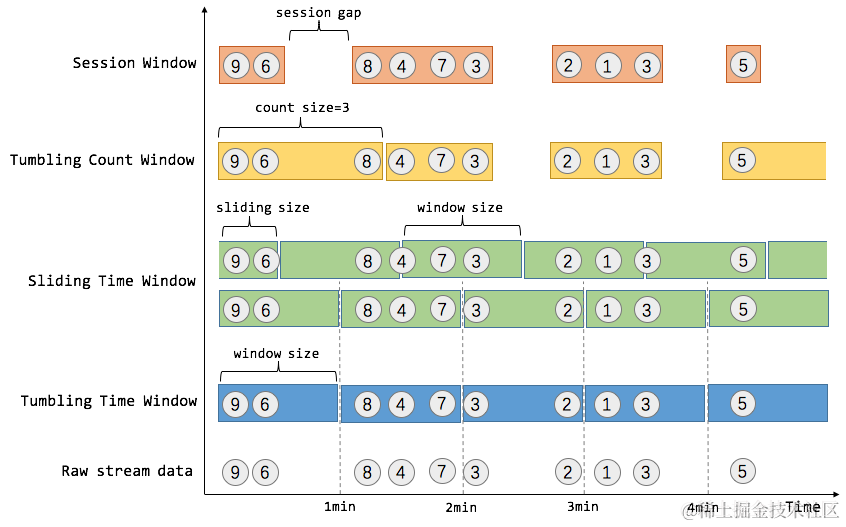 我们举个具体的场景来形象地理解不同窗口的概念。假设,淘宝网会记录每个用户每次购买的商品个数,我们要做的是统计不同窗口中用户购买商品的总数。下图给出了几种经典的窗口切分概述图: