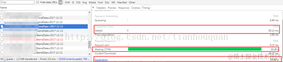 然后我就去查看我的ajax请求,数了一下,大约是在第6个请求的时候就开始有Stalled``时间了。