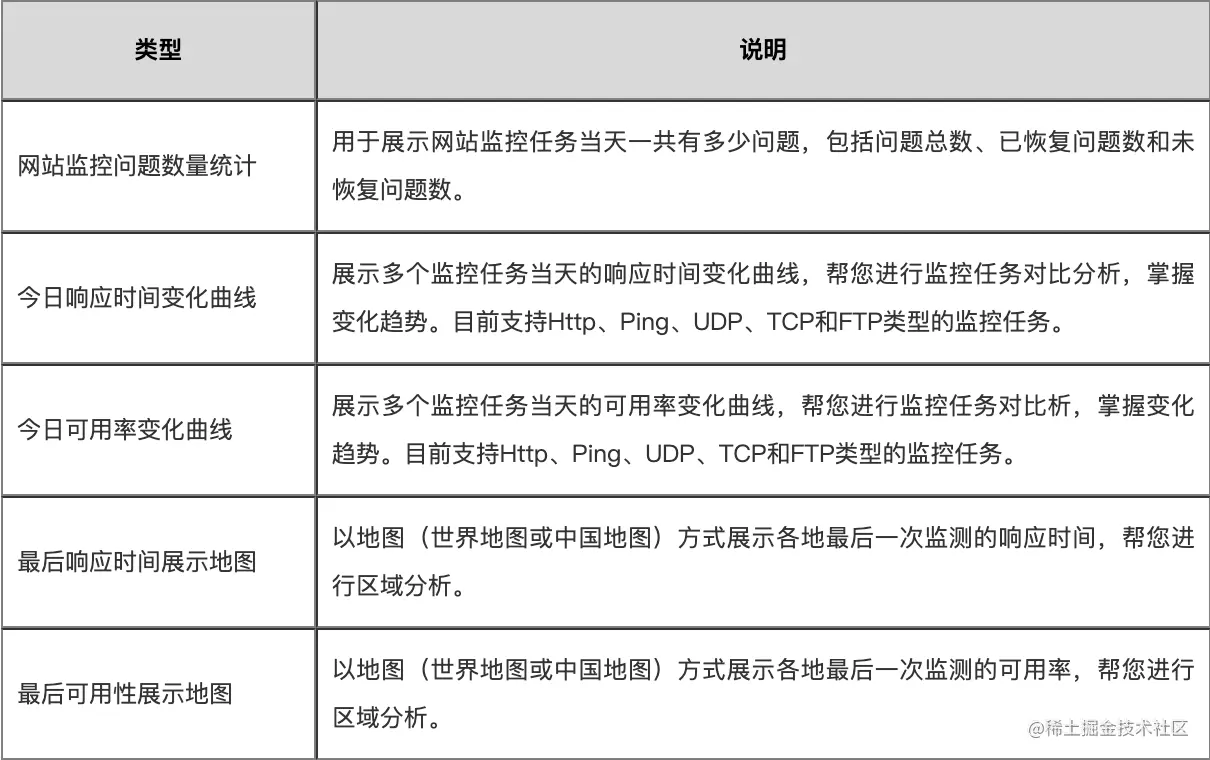 首先,选择要在widget中展示的图表,目前网站监控支持的图表见下表。