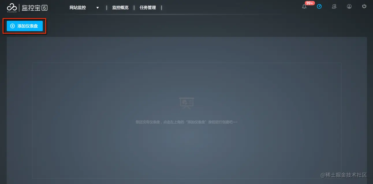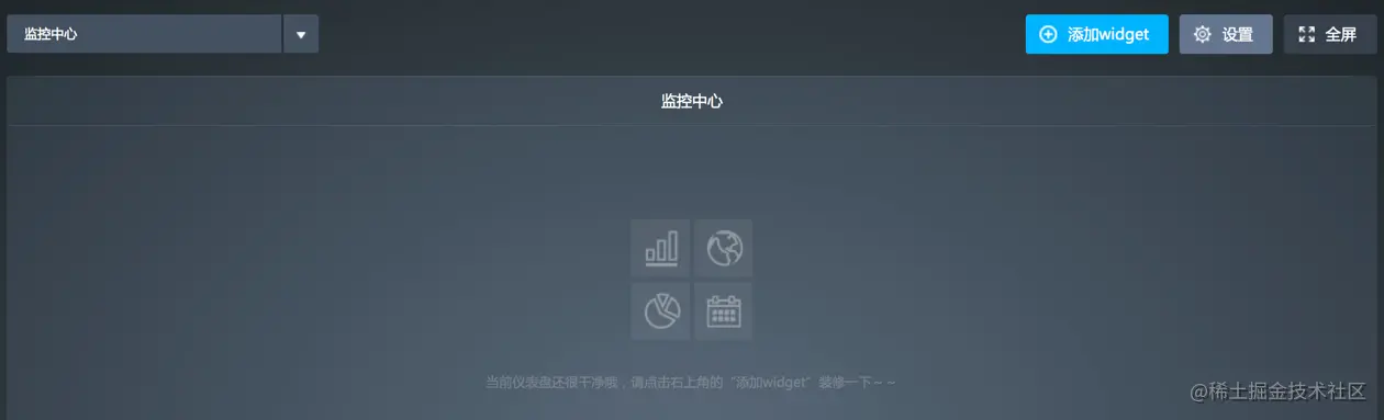 在监控宝仪表盘中,您可以通过丰富的Widget库来自由定制一个或多个个性化的仪表盘,将您所关心的全部数据集中展示出来,数据实时刷新,让您随时掌握项目最新动态。仪表盘支持大屏展示,图表数据更清晰。具体配置入口如下图所示: