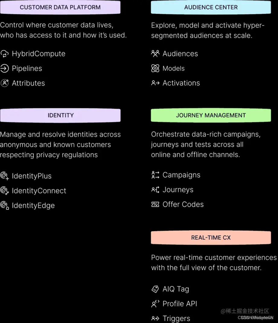 ActionIQ主要从:360度客户数据中心、客户身份解析、细分受众、营销活动编排、实时客户体验、个性化营销等六个方面进行构建。