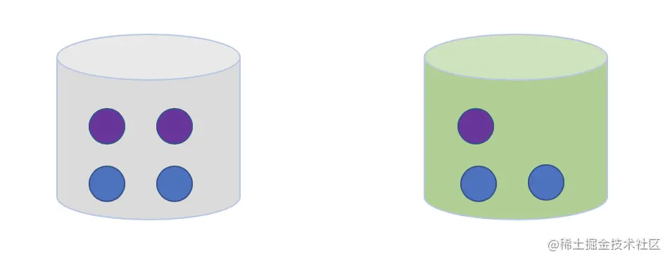 什么是条件概率,我们从一个摸球的例子来理解。我们有两个桶:灰色桶和绿色桶,一共有7个小球,4个蓝色3个紫色,分布如下图: