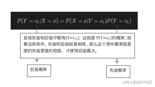 我们只需要计算以下两个概率即可,又由于朴素贝叶斯假设条件独立,我们可以单独计算每个特征的条件概率:和类目的先验概率:。为了更好的理解这个公式,看下图解释: