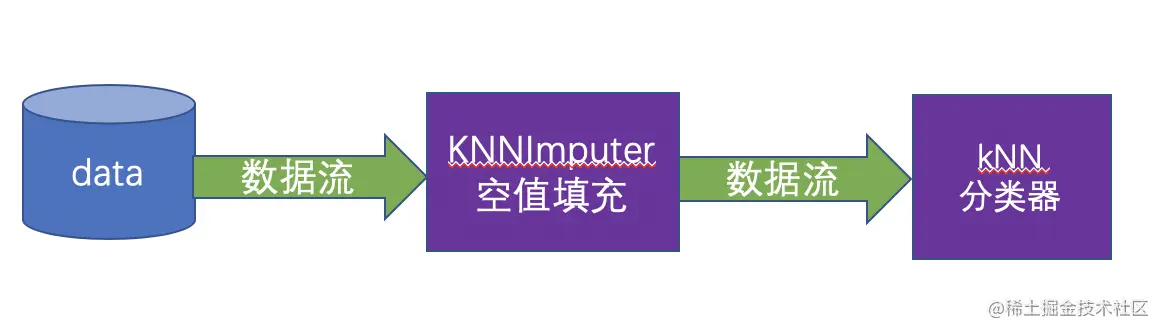 什么是Pipeline, 我这里直接翻译成数据管道。任何有序的操作有可以看做pipeline,例如工厂流水线,对于机器学习模型来说,这就是数据流水线。 是指数据通过管道中的每一个节点,结果除了之后,继续流向下游。对于我们这个例子,数据是有空值,我们会有一个KNNImputer节点用来填充空值, 之后继续流向下一个kNN分类节点,最后输出模型。