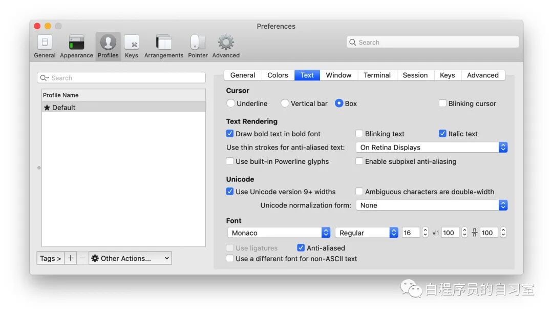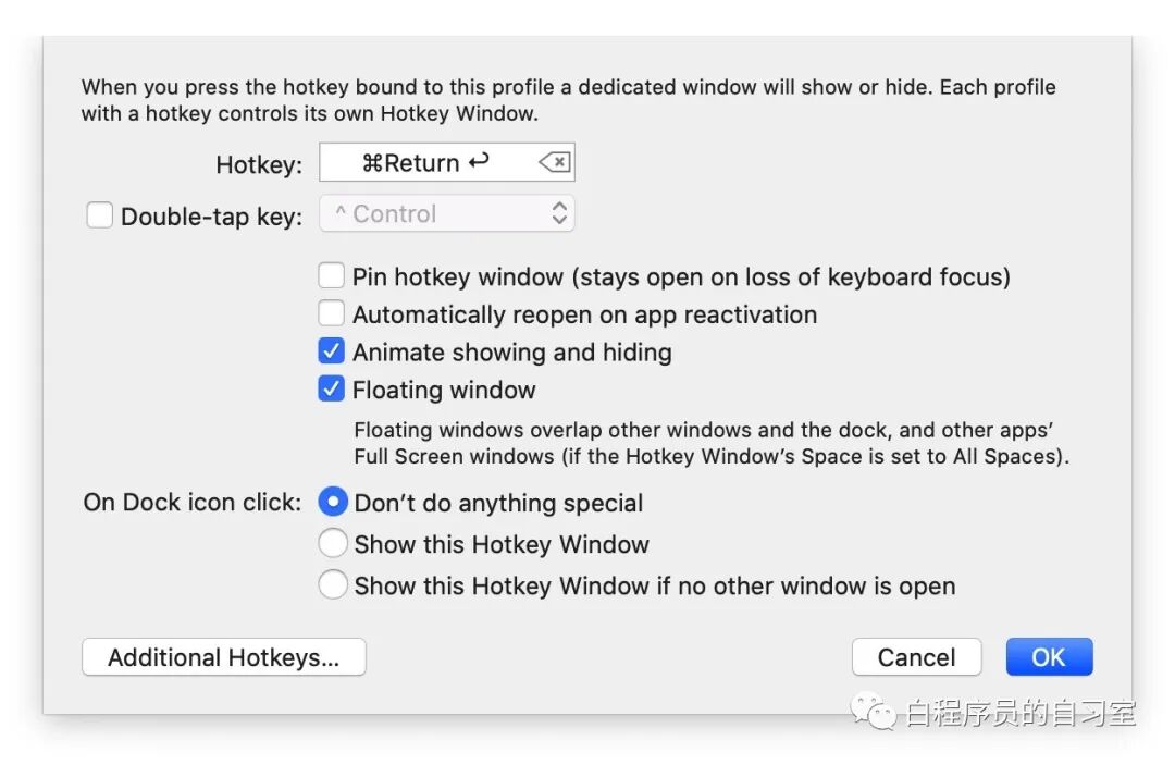 这个功能也非常使用,就是通过快捷键,可以快速的隐藏和打开 iTerm2,示例配置(Commond + enter):
