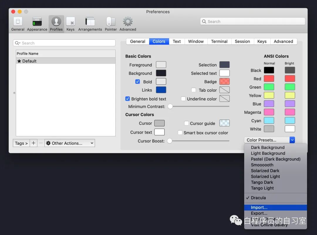 在 iTerm2 中 打开 Preferences 下面的 Profiles 的 Colors Tab 选项,使用 Import 导入配置,导入配置后,选中对应的dracula主题背景即可。