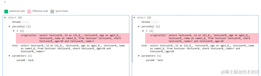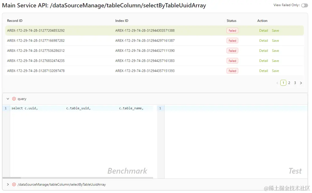 1.在报告页面中选择某条路径下 Case Table,可以看到每个回放用例的状态,如下图所示。点击 Detail 查看详情, Save 将该用例保存为常规测试用例。下图中的 Failed 用例左侧基准版本(录制)存在数据库查询(query),但右侧最新版本(回放)没有,则标识回放失败。