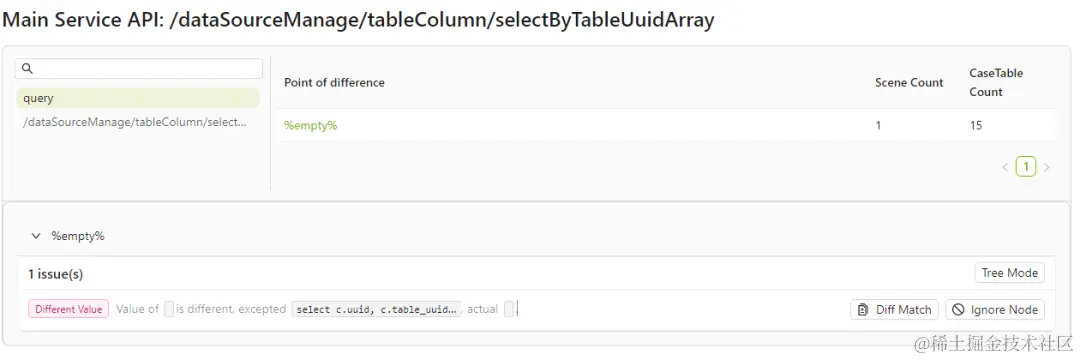 - 选择 Diff Scenes,进入分析比对差异页面,AREX 将该路径下的比对差异点进行了合并展示,方便开发及测试人员查看分析。