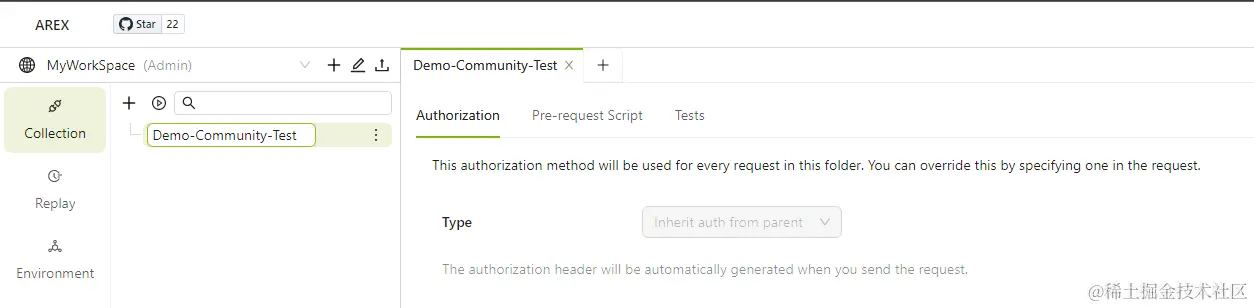 - 在 Collection 中新建一个名为 “Demo-Community-Test” 的集合,用以创建接口请求。