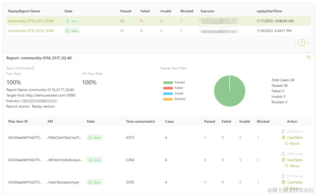 community.0.2.6 为本文中使用的测试应用 Arex-community-test(0.2.6 版本)的缺省名。随后 AREX 会记录下对这个服务接口地址进行的每个访问,包括请求和应答,以及被测服务对外部依赖的访问(数据库,Redis等等),这个过程就是 AREX 的录制过程。