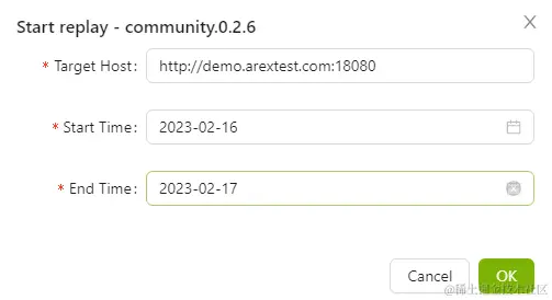 在录制完成后,点击页面右上角选择 Start Replay 开始回放测试。依次选择回放测试的地址(为了演示方便,本次演示中录制和回放采用同一个地址 demo.arextest.com:18080)及需要回放的用例的录制起止时间。