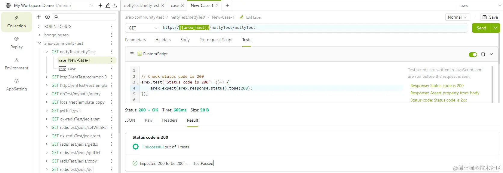http://{{arex_host}}/nettyTest/nettyTest,其中{{arex_host}}是参数名为arex_host, 值为demo.arextest.com:18080的环境变量,需提前在 Environment 中进行配置。也可直接输入 demo.arextest.com:18080/nettyTest/n… 作为接口路径,但如果需要在多个环境(如生产环境、测试环境、开发环境等)进行测试时,逐个修改前置 URL 比较费力,因此建议使用环境变量,在不同环境进行测试只需切换环境即可。 -