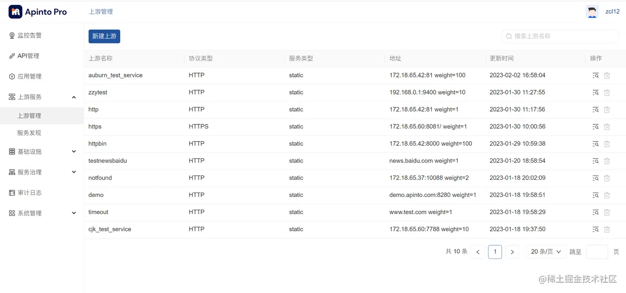 第一步:点击上游服务菜单,展开后再点击上游管理进入上游管理列表页面,如下图所示: