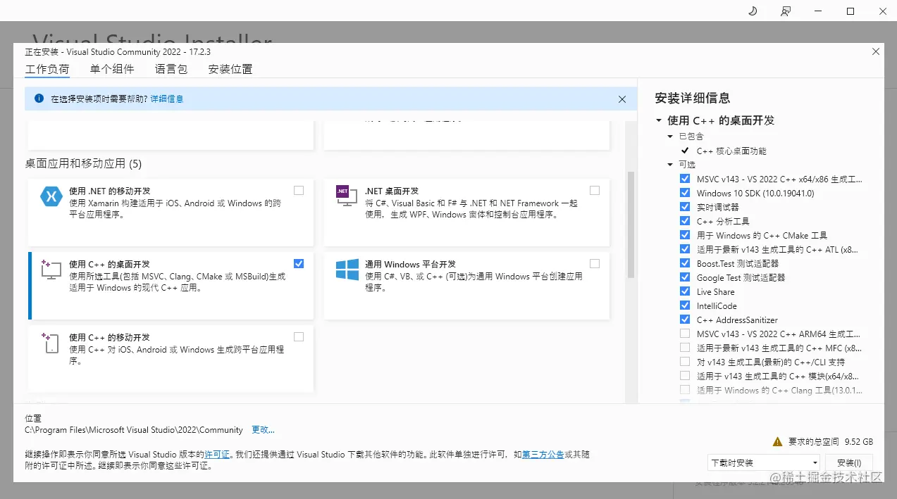 下载安装 Visual Studioopen in new window,选中“使用C++的桌面开发”和“使用C++的移动开发”,这东西安装有点费内存: