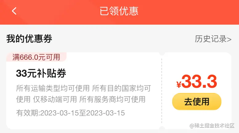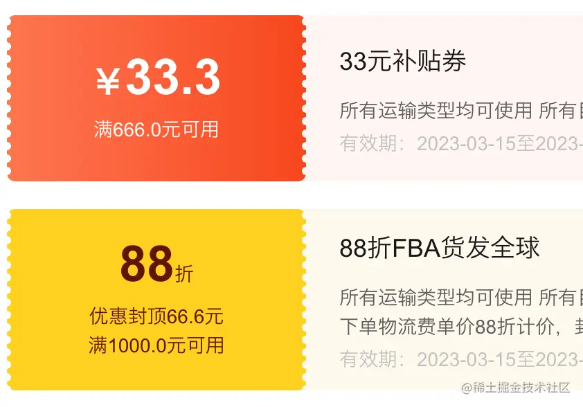 左右布局,中间虚线分割,分割处上下有个内凹半圆,也是很常见的移动端优惠券布局: