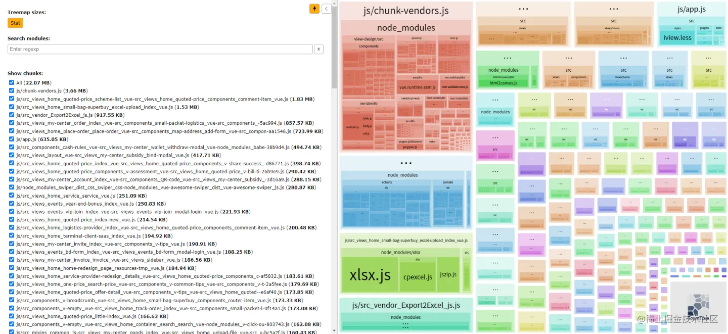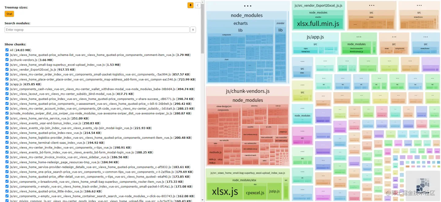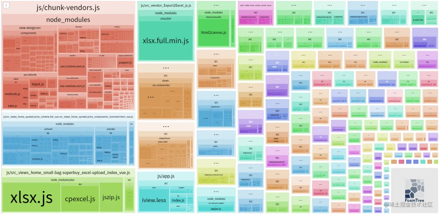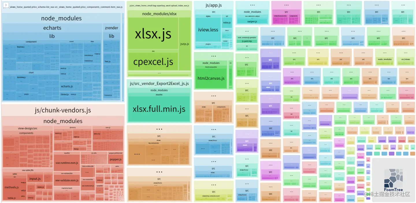 - 打包最大的单个文件:依赖了 echarts 的页面,大小为3.79MB,还有 xlsx 和 html2canvas 也比较大