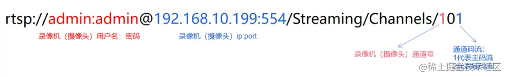 rtsp://admin:admin@192.168.10.199:554/Streaming/Channels/101(通道1主码);