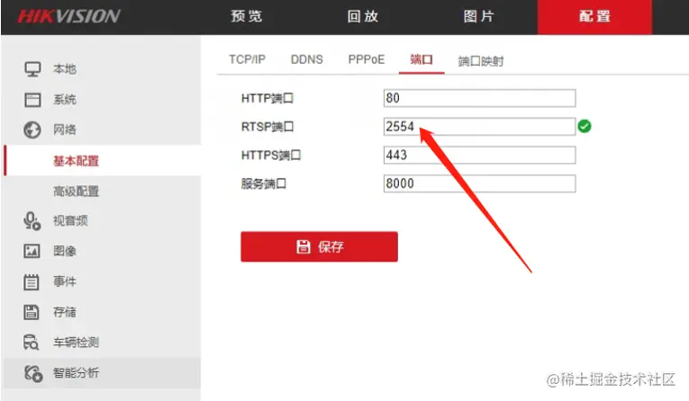 进入录像机后台的配置,找到【网络】-【基本配置】-【端口】,确认该录像机的RTSP端口是2554,将RTSP地址中的端口改为2554后,用户的设备已经成功显示在线。