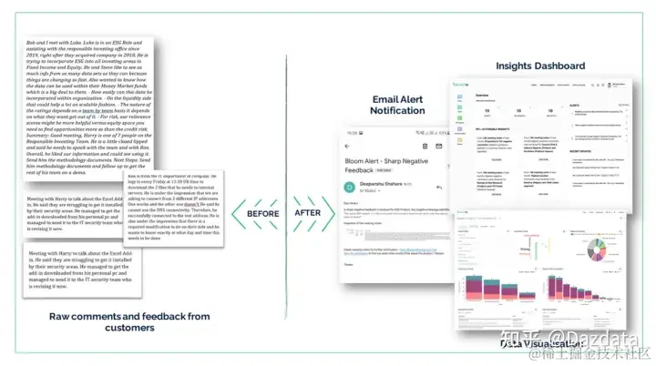视觉见解 – 对于利益相关者,将客户反馈聚类、分析和安排为关键主题和视觉见解。