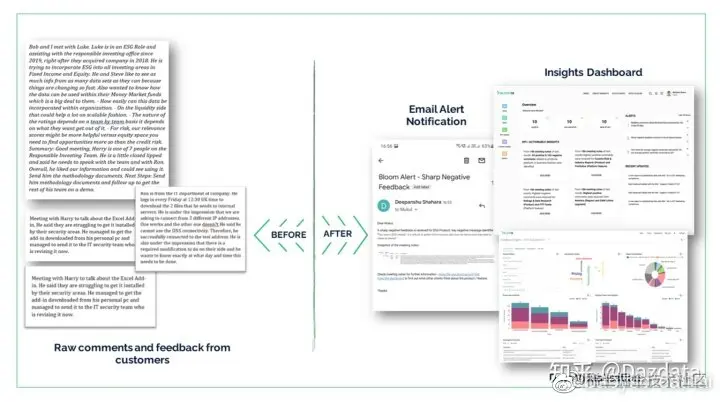 Bloom AI数据交付平台为产品和客户成功团队提供了业务洞察力。客户在 Salesforce 中捕获客户/潜在客户的互动,而 Bloom AI 平台为客户团队提供了主题分析、视觉洞察和智能警报。