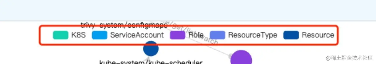 图形中部的圈代表不同的资源,资源会以namespace分类,每一个外层的圆圈代表一个namespace。内层的圆圈代表处于namespace中的具体资源。圆圈会被显示为不同的颜色,这些颜色代表风险等级,目前分为5类风险等级,具体如下: