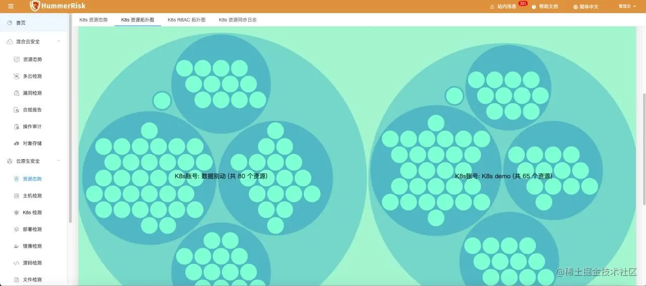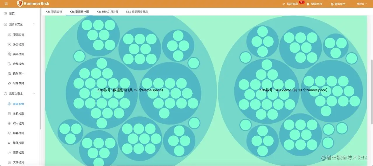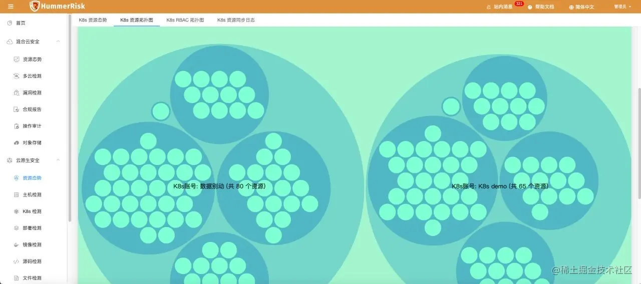系统中另一个资源态势,是针对 K8s 容器云的部分。这里我们会将系统中绑定的多个容器云环境进行汇总,统一将资源信息进行展示和拓扑呈现。和混合云部分相同,想要使用资源态势也需要先绑定 K8s 环境的账号。