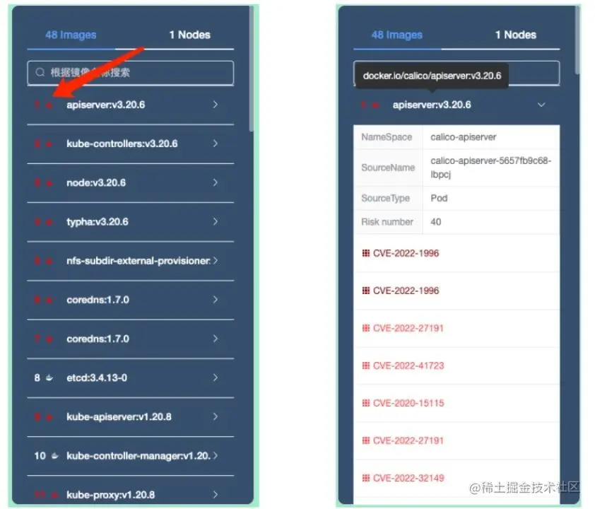 左侧的images列出K8s中使用的全部镜像,并且基于「K8s 检测」和「镜像检测」的结果,其中存在风险的镜像会显示为红色,展开镜像信息,可以看到具体的漏洞情况。