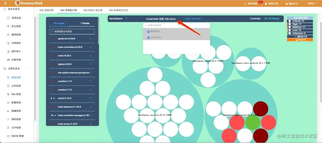 本视角的资源拓扑核心目标是展示集群的风险情况,如下图: