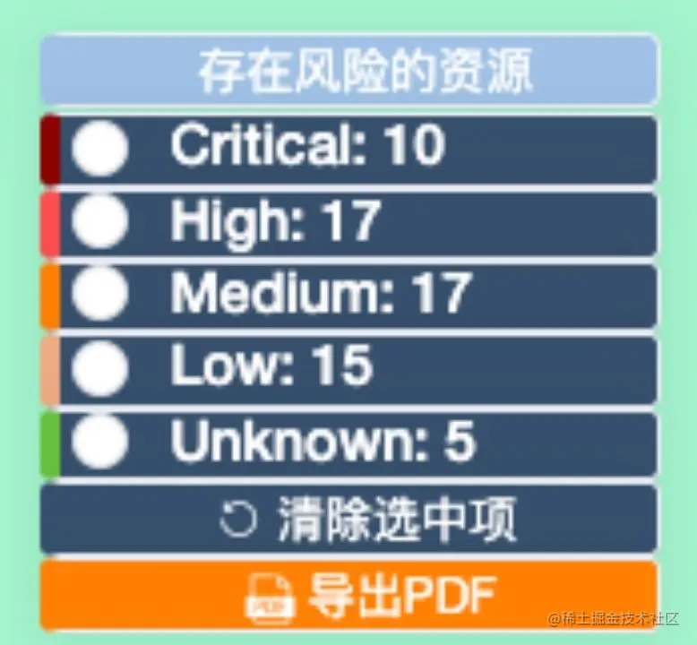 可以通过右上角的选项,可以通过风险等级对资源进行过滤,还可以点击「导出PDF」将拓扑图下载下来。如图: