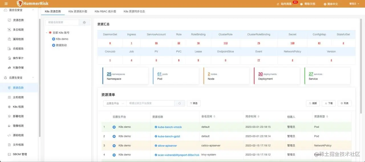 HummerRisk 是开源的云原生安全平台,以非侵入的方式解决云原生环境的安全和治理问题。核心能力包括混合云的安全治理和容器云安全检测。