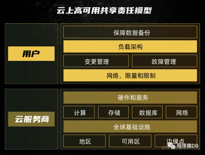 (下图展示了云服务厂商和用户的高可用上的责任模型:云服务商提供的主要是基础硬件服务的高可用能力。而我们之前所提到的业务容错(负载架构)、容灾(保障数据备份)能力都是在用户侧的。供参考)