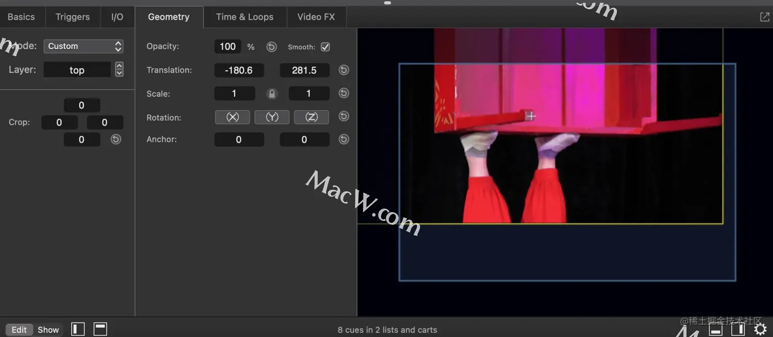 - 一个全新的视频引擎,建立在 Metal 之上,它带来了新的视频效果、每个 cue 的多个视频效果、每个 cue 的混合模式,以及一个不错的小性能改进。我们还添加了 NDI 输入和输出,并改进了对 Hap 和 Hap Alpha 的支持。