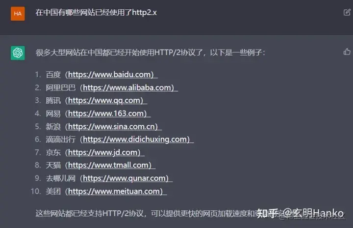 许多中国的大型网站和公司也已经开始使用HTTP/2协议来提高他们的网站速度和性能。以下是一些正在使用HTTP/2协议的知名中国网站和公司: