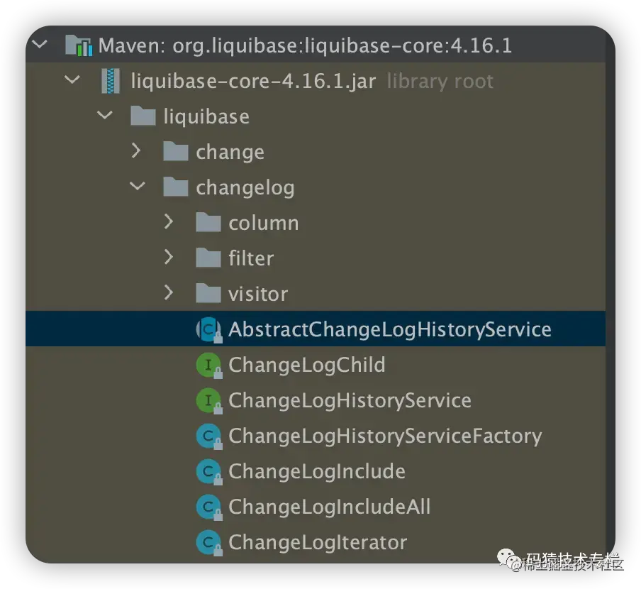 我们查找一个 AbstractChangeLogHistoryService 文件所在位置,发现它是 liquibase-core 包下的文件,如下所示: