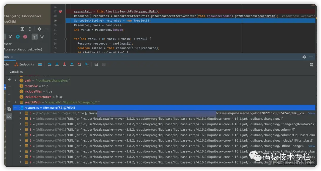 其中 searchPath 变量值为 classpath*:/liquibase/changelog/**,然后通过 ResourcePatternUtils 读取文件时,就把 liquibase-core 包下同路径的文件都扫描出来了。如下图所示: