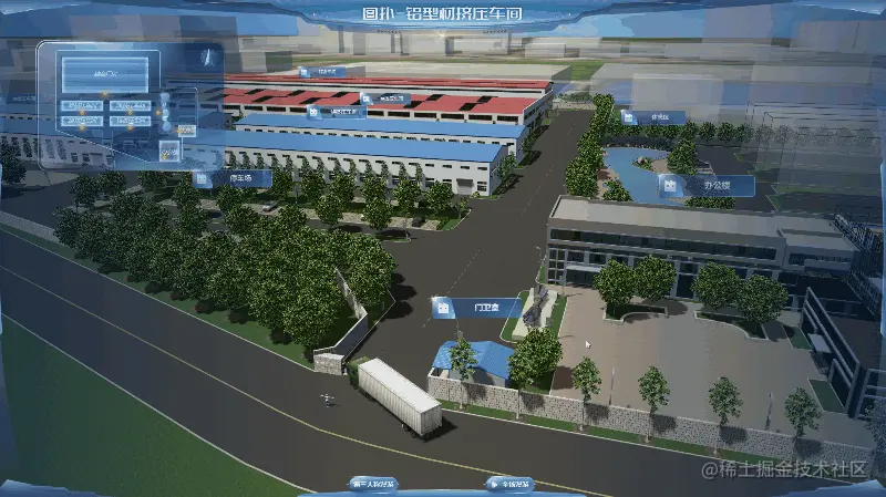 本次铝型材挤压产线案例,图扑软件利用 Web 3D 技术搭建基于实际厂区的虚拟可视化铝型材制造工厂,厂区内有办公楼、挤压车间、休息区、体育场、综合厂房等建筑,辅以厂区内绿植、道路、路灯、停车场、篮球场、湖泊等周边设施,通过图扑软件自研引擎,并结合 PBR 物理渲染材质系统,渲染出真实厂区的环境效果。