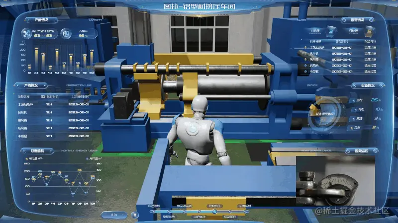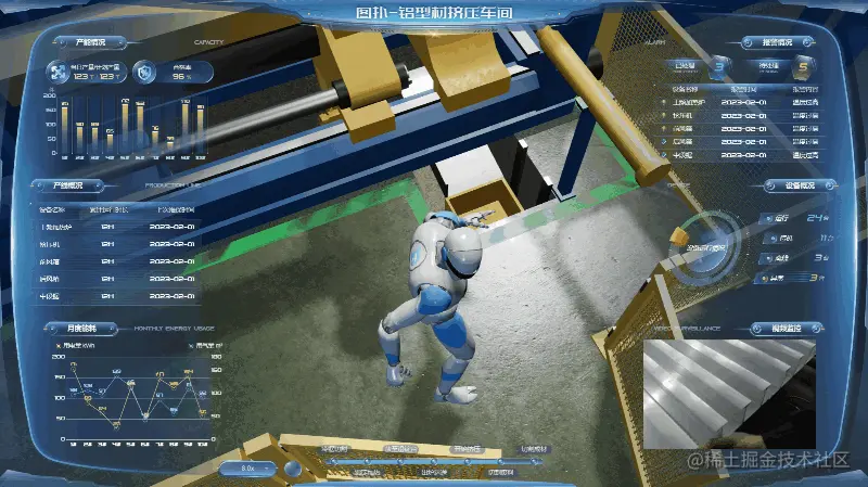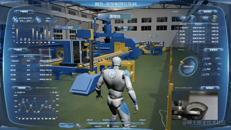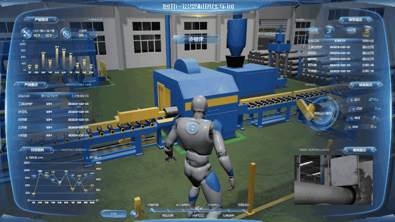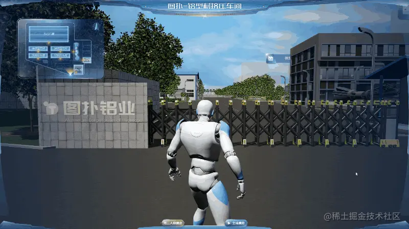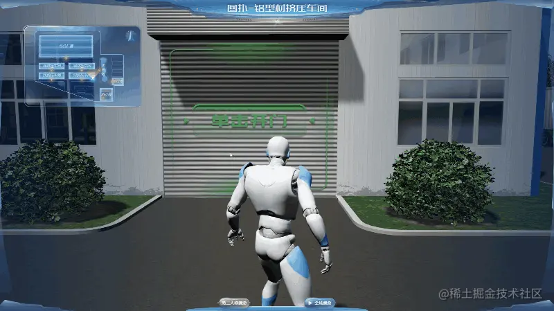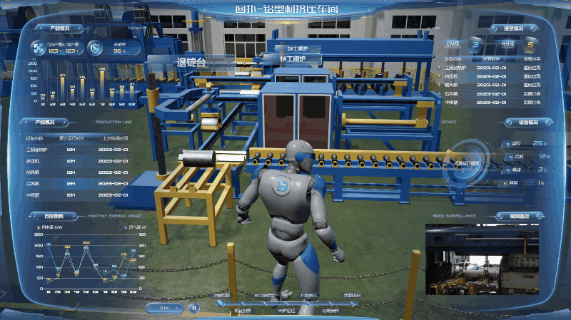 在第三人称漫游视角下,可操控图扑虚拟小人来到挤压车间门口点击“点击开门”字样,车间卷帘门即会自动打开,同时两侧浮现挤压车间的数据面板,操控小人进入厂房内即可看到整条铝型材挤压生产线,小人走出车间后,卷帘门会自动下放,两侧面板也随即收起。