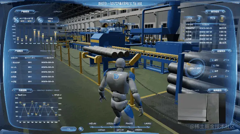 挤压车间生产管理可视化系统能够通过图扑软件的 HT 可视化引擎,将 3D 场景与 2D 面板结合起来,对铝挤压车间进行全方位的数字化建设,全面掌握车间内产能信息与运维情况等信息。可以通过鼠标和键盘的常规交互操作,实现对场景的旋转、平移、缩放;操控图扑虚拟小人进入挤压车间后,页面两侧会出现整个车间相关数据,供车间负责人和相关管理工人管理查看相关数据。