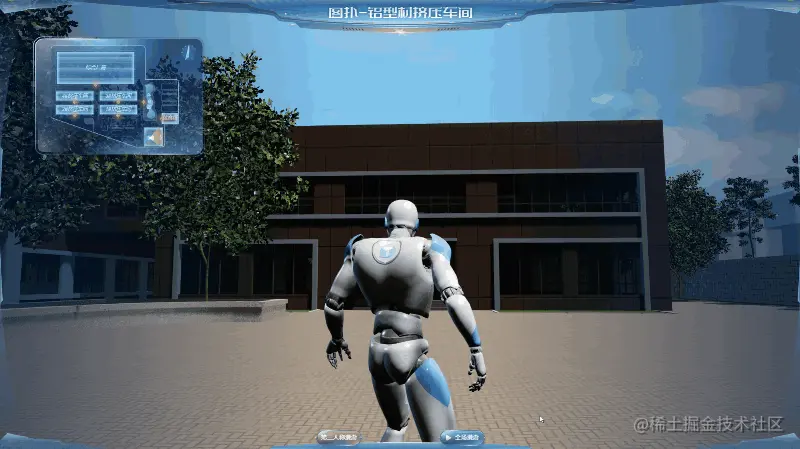 整体案例采用写实的风格辅以 PBR 材质技术打造铝型材智能制造工厂,首先映入眼帘的是工厂外景,包含厂区的厂房、办公楼、道路、绿植、湖泊、停车场、篮球场等,以真实的样貌还原出厂区外景,还可切换到第三人称操控人物在场景内自由移动,使观看者仿佛身临其境的查看整个厂区的环境、建设情况。