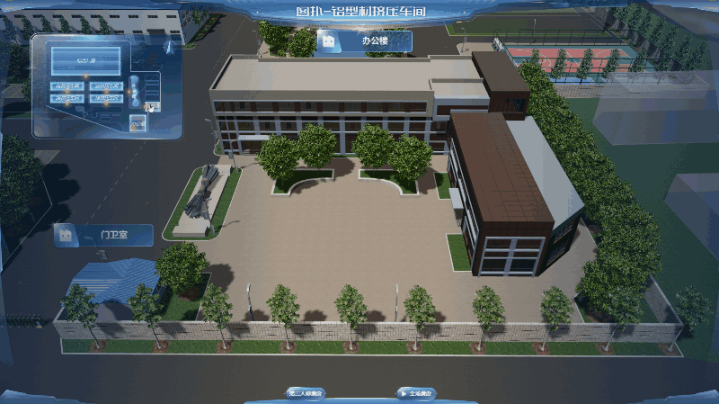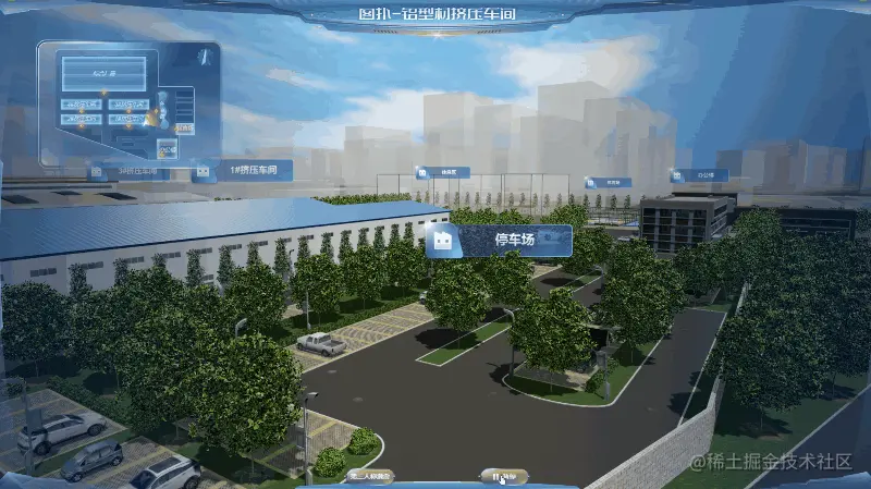 图扑软件利用 Web 2D 和 3D 可视化相融合的技术,依据真实厂区的道路和环境布局,在页面左上角制作出一个厂区导航地图,地图上标注出了厂区各个建筑的名称以及点位,点击对应点位视角会直接跳转到该地点,方便用户对整体三维可视化场景进行查看。