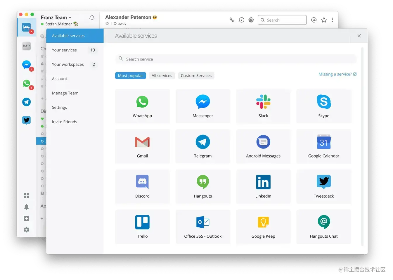Franz是一款聊天软件聚合工具,可以将各种聊天软件(如微信,WhatsApp、Telegram、Slack等)集成到一个界面中,它可以帮助你更轻松地管理多个消息应用程序,并节省桌面空间。