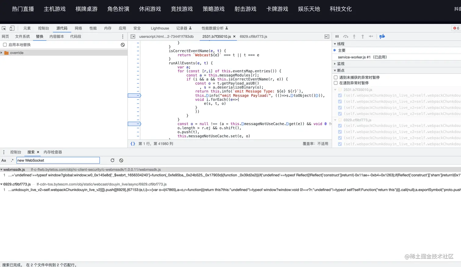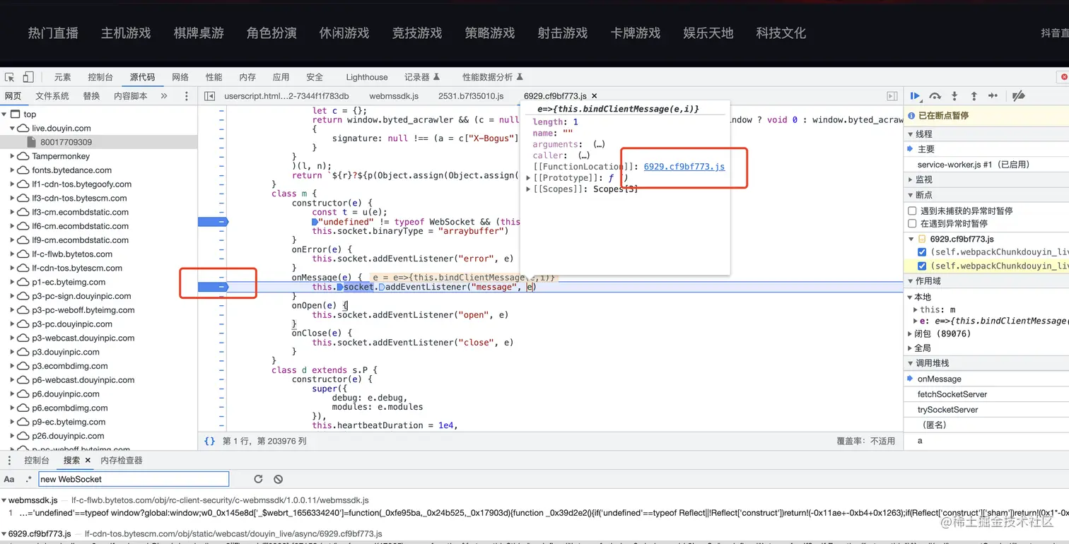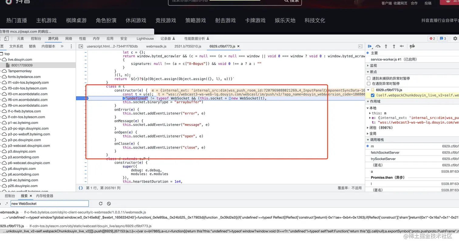 我们可以搜关键字new WebSocket、 open, message等这里的; 我们搜索下new WebSocket,只有2处,都点进入打上断点,刷新页面 断点成功断住,看了一眼抖音这块代码,与上面的js websocket通讯模板是极其相似