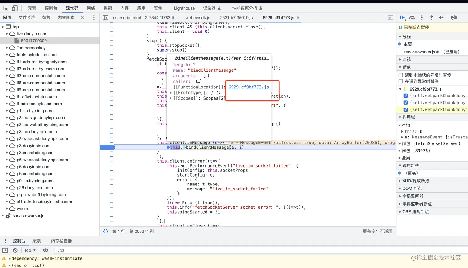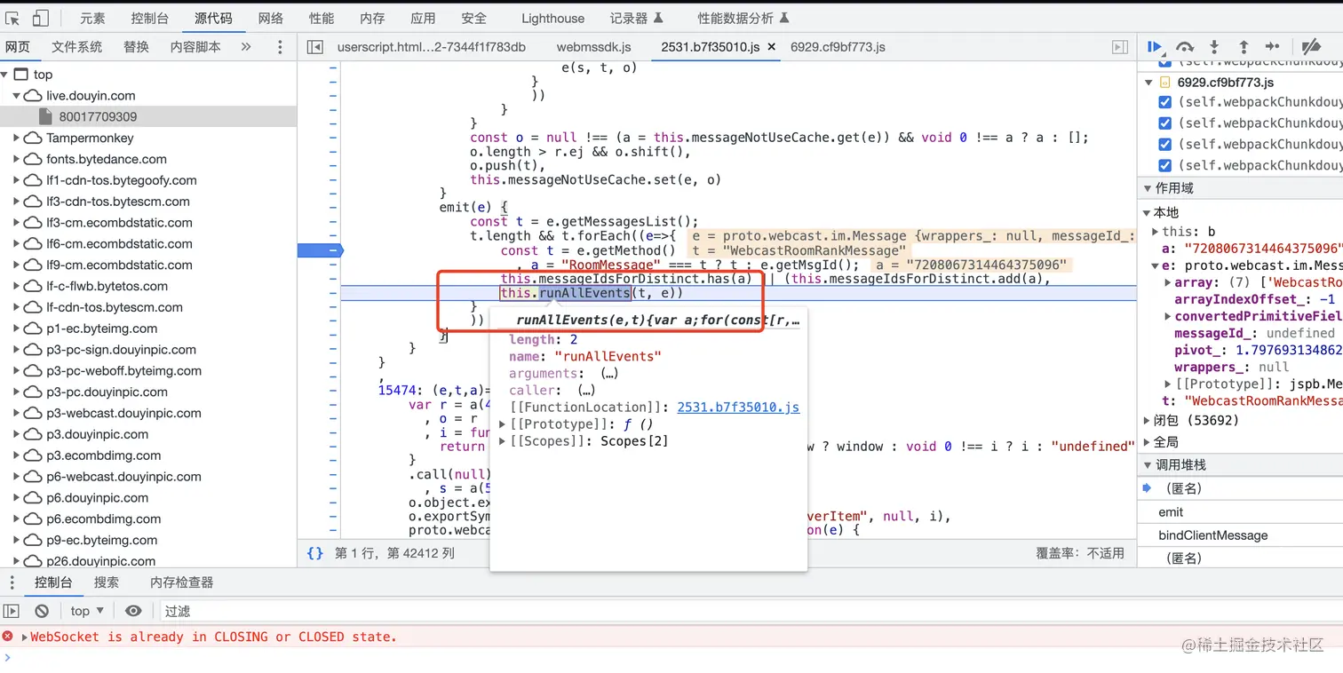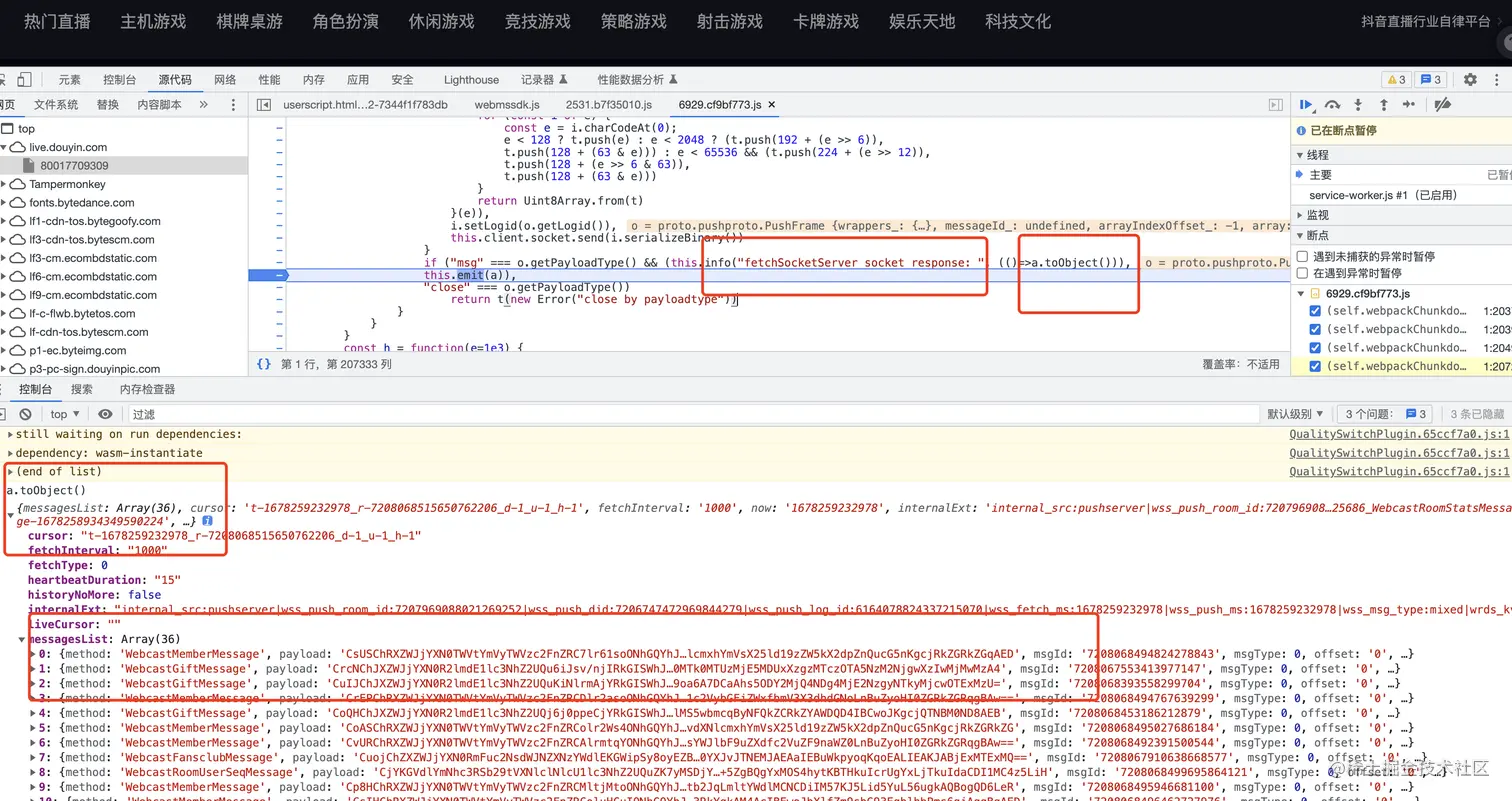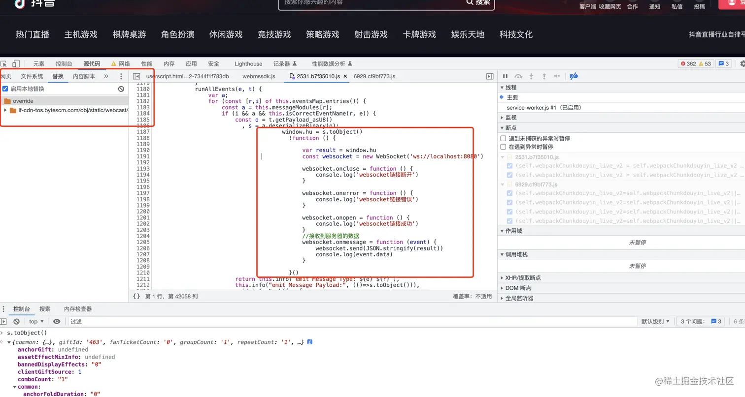 我们可以搜关键字new WebSocket、 open, message等这里的; 我们搜索下new WebSocket,只有2处,都点进入打上断点,刷新页面 断点成功断住,看了一眼抖音这块代码,与上面的js websocket通讯模板是极其相似