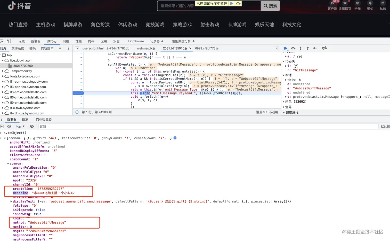 - 浏览器打开网页版抖音直播间,F12进入控制台
